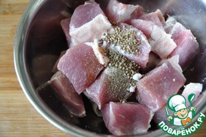 Для приготовления лучше брать свинину с небольшими кусочками сала - шею или лопатку. Режем кубиками со стороной около 4 см.