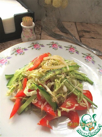 Сочный, яркий, летний салатик из свежих овощей. В меру пикантный и очень интересный. Угощайтесь!!!