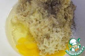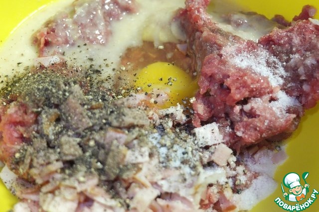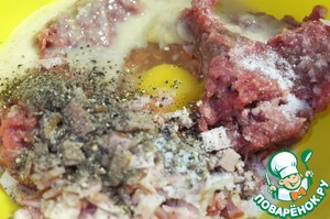 Для котлет смешиваем фарш, мелко нарезанный бекон, хлеб, вымоченный в воде, яйцо, чеснок. Солим перчим.