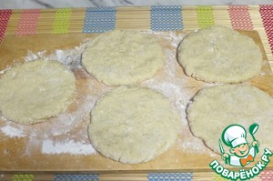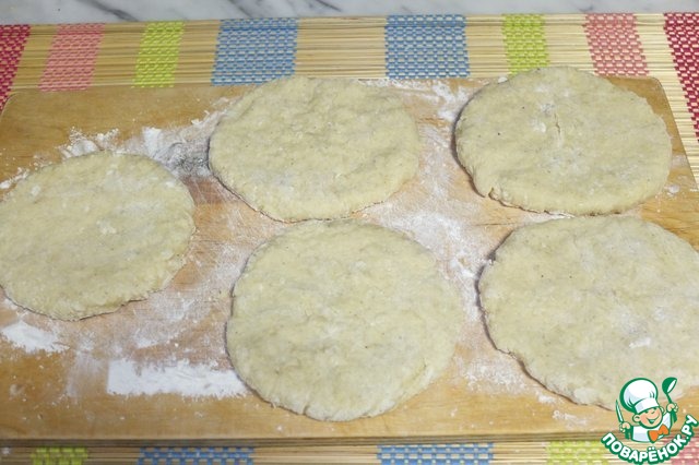 Замешиваем крутое тесто. Формируем лепешки и выкладываем на присыпанную мукой поверхность.