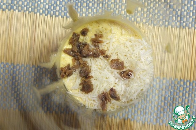 Добавляем мелко нарезанные анчоусы, пармезан, натертый на мелкой терке и чеснок, пропущенный через чеснокодавилку. Смешиваем до однородности.