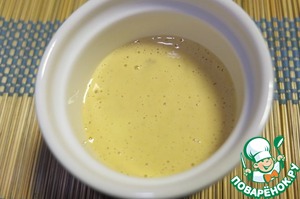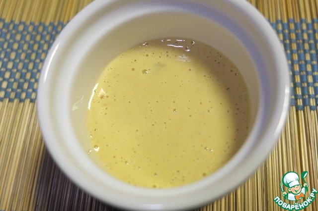 Для соуса - в чаше погружного блендера смешиваем желток, горчицу, масло, уксус. Взбиваем до получения однородной эмульсии.
