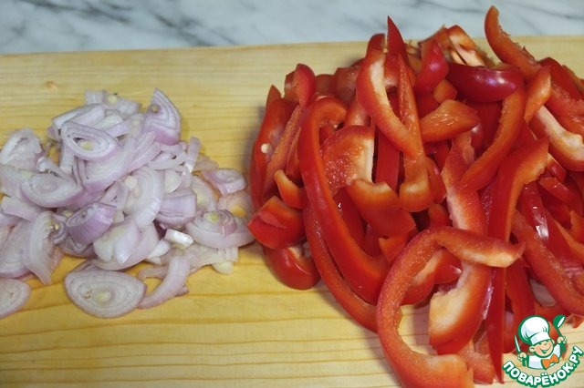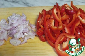 Болгарский перец нарезаем соломкой, лук-шалот кольцами. -