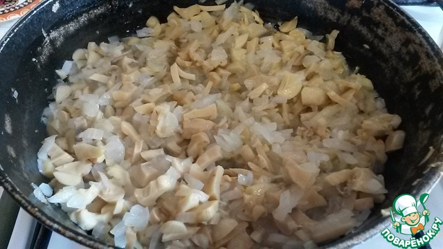 Режем шампиньоны не очень мелко и тушим вместе с луком
