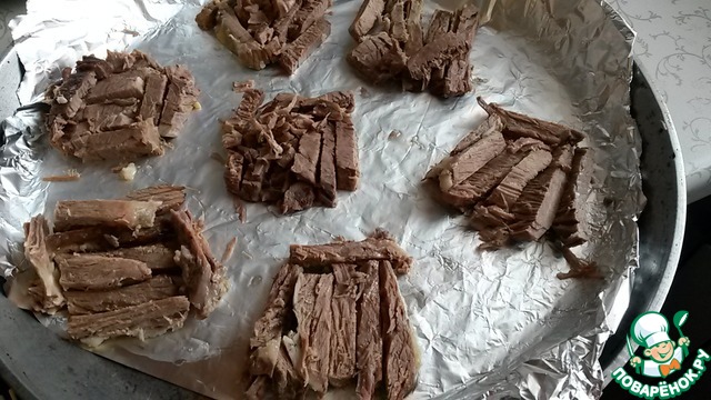 В это время режем мясо на брусочки и раскрадываем на фольгу. Я взяла сковороду большую, можно противень