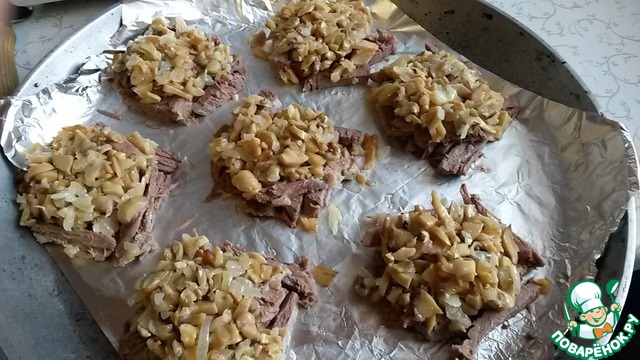 Сверху кладем шампиньоны с луком
