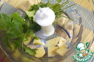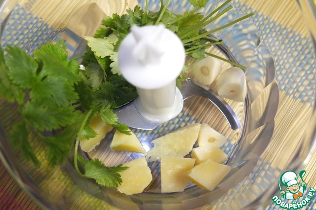 Для соуса измельчаем кинзу, пармезан и чеснок.