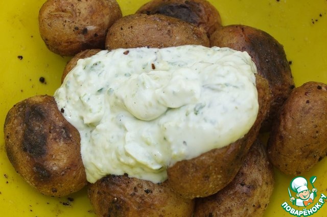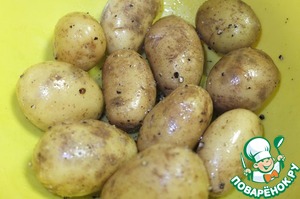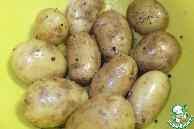 Молодой картофель тщательно моем, солим, перчим, добавляем растительное масло, перемешиваем.