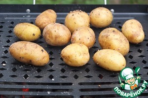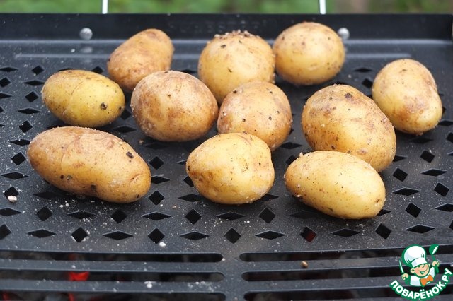 Противень устанавливаем на мангал и выкладываем картофель.