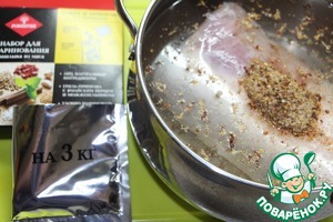 Кусок карбонада (или любая другая часть свинины) поместить в емкость для маринования. Добавить 1 ст. л. приправы (в составе уже содержится соль и перец), влить минеральную газированную воду (она тоже содержит соль)
