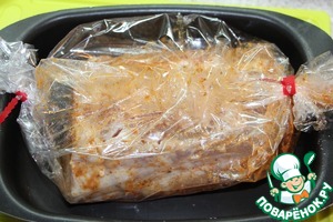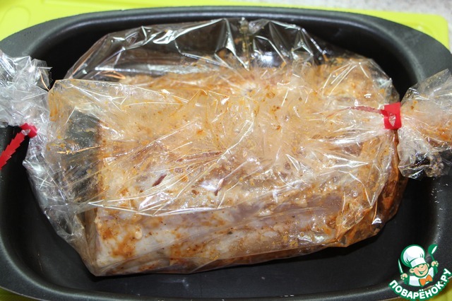 Поместить мясо в пакет для запекания и поставить в духовку, разогретую до 180 градусов, на 1.5 часа