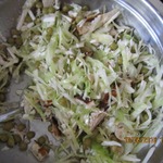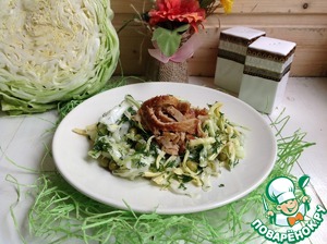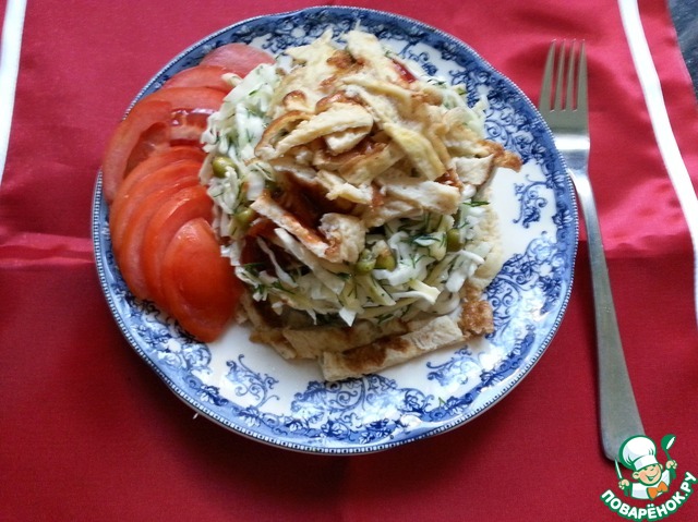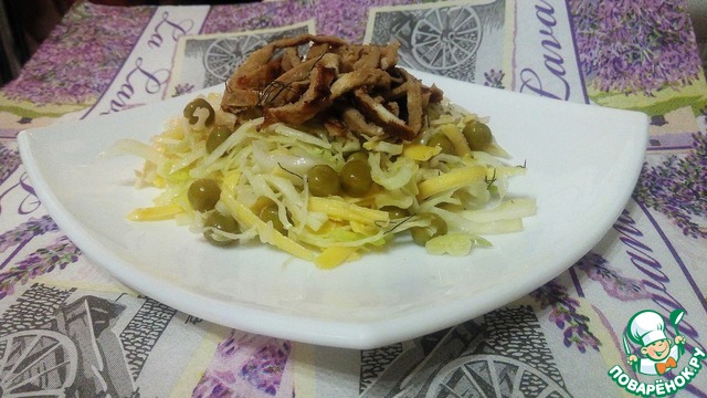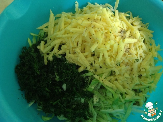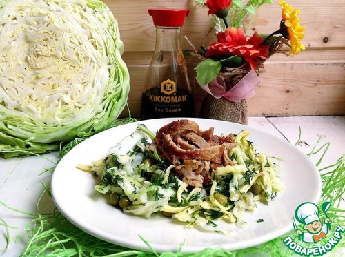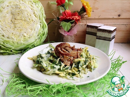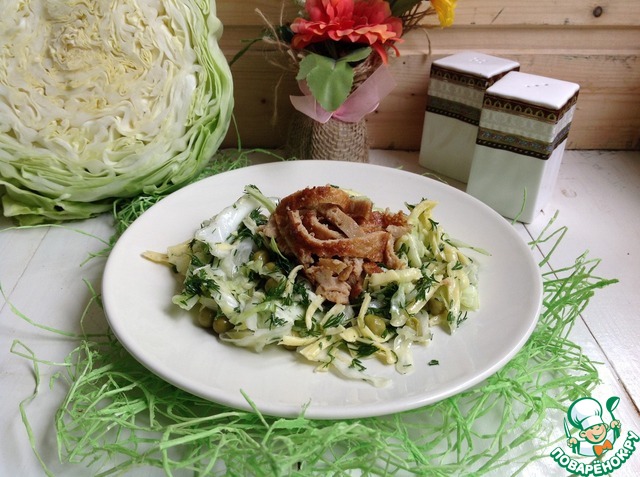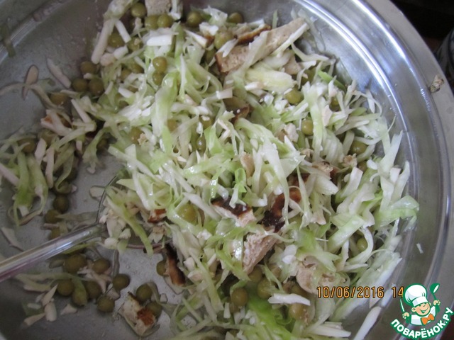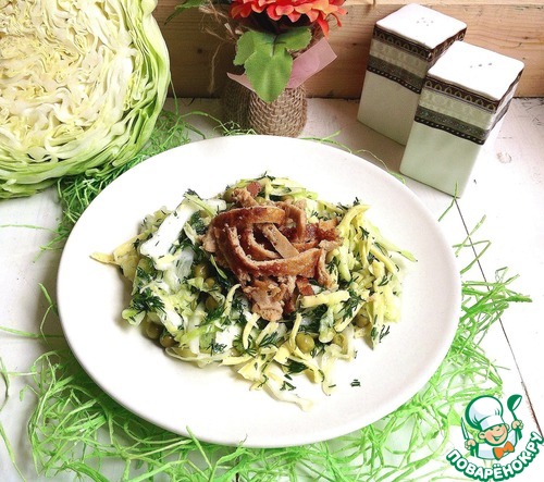 Молодую капусту нашинковать, добавить горошек и измельченный укроп.
