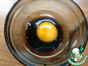Яйцо взбить с соевым соусом и пожарить омлет. Готовому омлету дать остыть и нарезать тонкой соломкой.