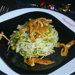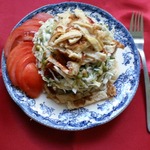 Салат выложить на тарелку горкой и в центр аккуратно разместить омлетную соломку.