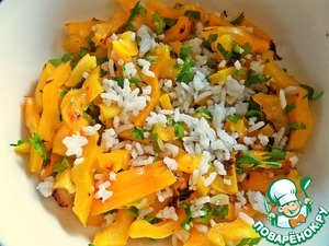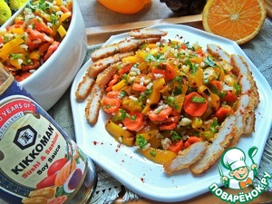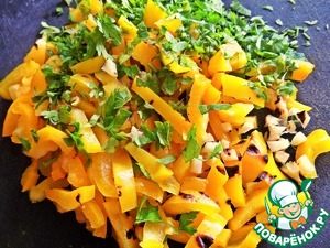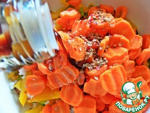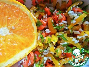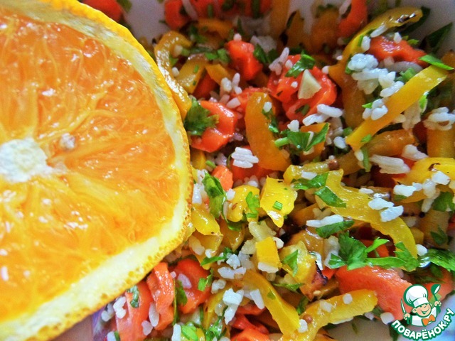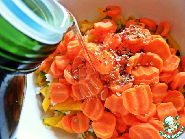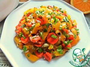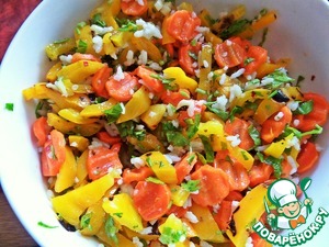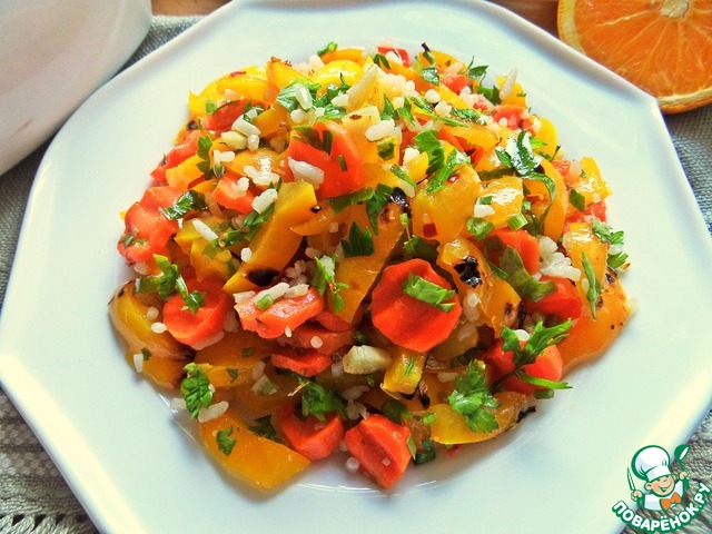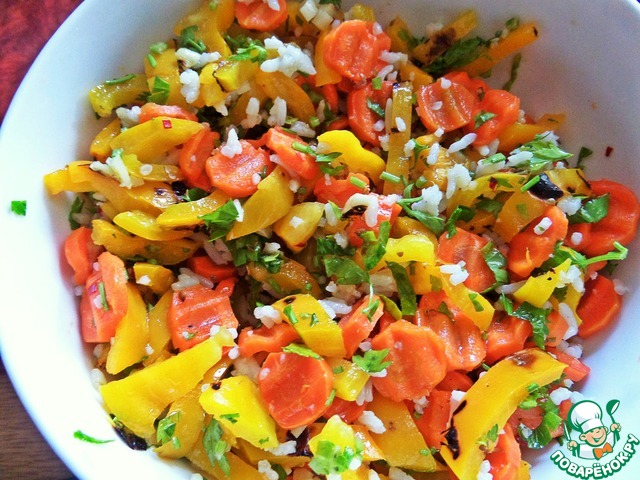 Любителям пикантных овощей понравится такой салат, он и сытный, вполне может заменить ужин в жаркий день. Запечённые перцы привносят неповторимый аромат и вместе с морковкой придадут праздничность салату.