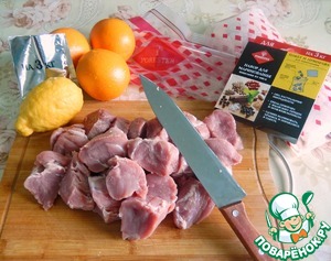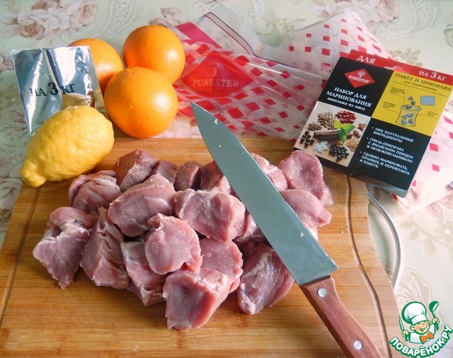 • Лимон и апельсины моем, готовим пакет для маринования. Пакетами для маринования пользуюсь давно и очень люблю их за удобство. Мясо моем нарезаем на медальоны, закладываем в пакет.