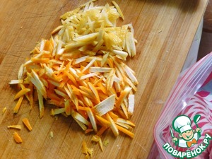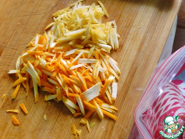 • Из цитрусов выжимаем сок прямо в пакет с мясом, а цедру нарезаем.