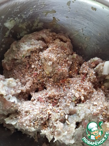 Добавьте специи к фаршу. Они уже содержат соль, но при желании - добавьте соль по вкусу. Фарш хорошо отбейте, бросая его в миску раз 10-15.