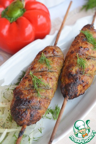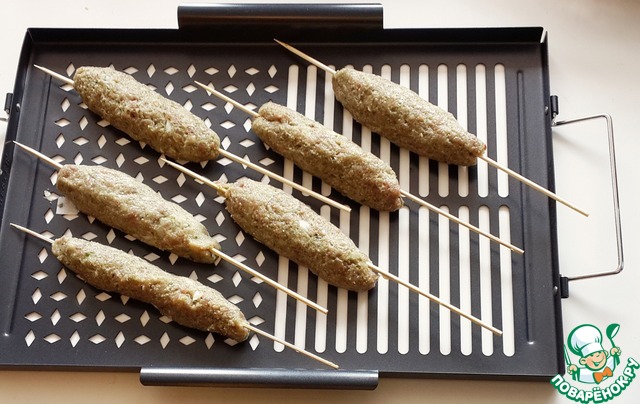 Сформируйте кебабы вокруг деревянных шпажек (шпажки предварительно замочите в воде на 30 минут). Готовить их можно, кстати, даже на сковороде! Но раз уж мы на даче и мангал зовет - то конечно на углях. Часть кебабов я готовила на противне-гриль, часть на решетке - оба варианта были удачными!