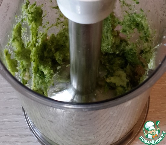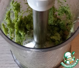 Влейте к черемше воду и измельчите её в пюре, добавьте к фаршу и хорошо перемешайте