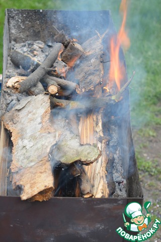 Разожгите мангал. Мы пользуемся на даче дровами, можно использовать готовый уголь - тут уж как вам удобнее. Дрова должны прогореть и остаться пепепельно-серые угольки - это сигнал, что можно начинать жарить мясо