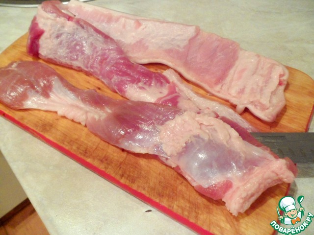 Грудинку без косточек разрезать вдоль на 3 части в виде буквы Z, не дорезая до конца каждого края.