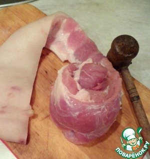 Получилась длинная мясная лента. Отбить ее немного деревянным молоточком.