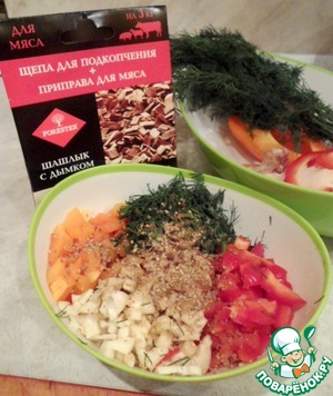 Для начинки мелко нарезать чеснок, укроп, 2 цвета болгарского перца и добавить ¼ приправы для мяса «Шашлык с дымком» от компании Forester, они придадут особый, незабываемый вкус нашему блюду.