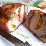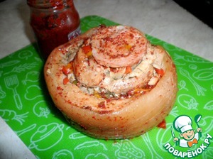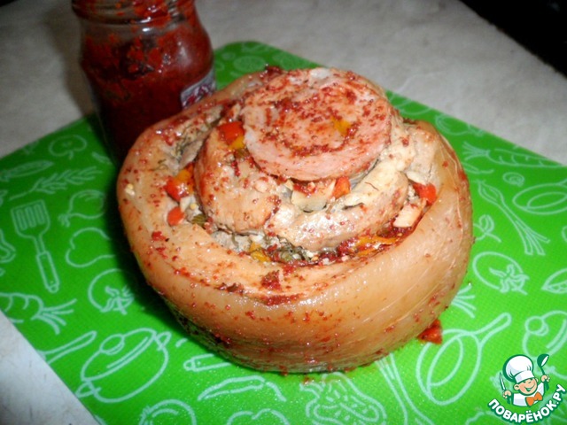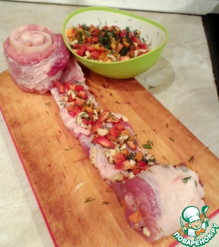 Эту начинку положить тонким слоем на наше мясо и свернуть рулетом.