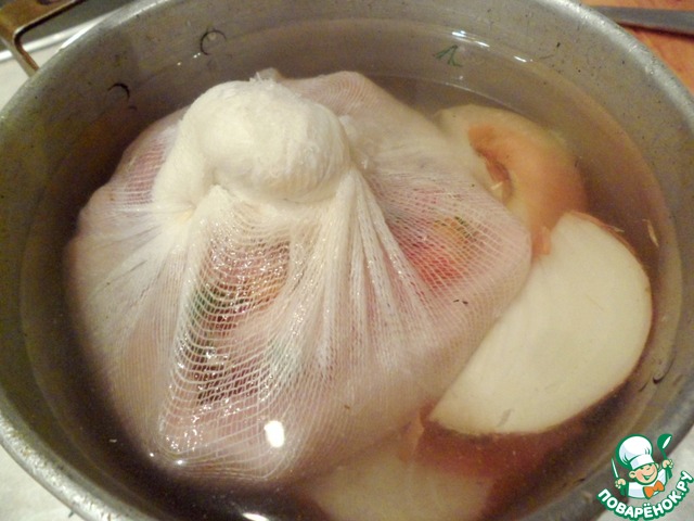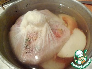 Завязать его в марлю, положить в небольшую емкость (можно туда положить 1 неочищенную луковицу), залить водой, чтобы чуть покрыло мясо, положить 2ст. л. соли с горкой и варить после закипания на медленном огне 1 час.