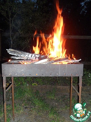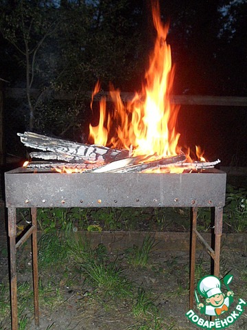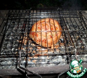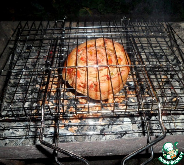 На тлеющие угли высыпать предварительно замоченную на 30 минут щепу от набора «Шашлык с дымком» от компании Forester, сверху поставить решетку от компании Forester с нашим рулетом и готовить рулет с копчением до готовности.