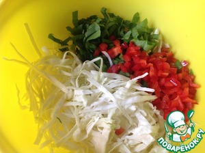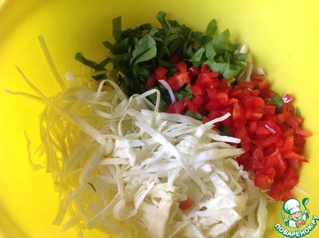 Молодую капусту нашинковать, щавель измельчить, перец нарезать маленькими кубиками.