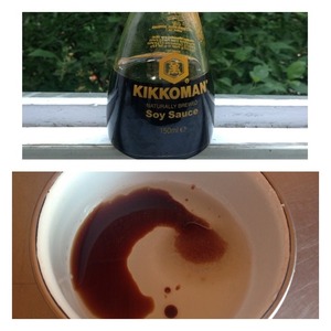 Соевый соус смешать с растительным маслом и щепоткой сахара. Перемешать и заправить салат.