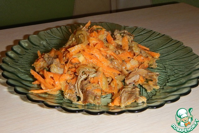 Да, вот такой, кажется, простой салат готовлю уже лет 25, и никого он не оставляет равнодушным. Только надо учесть, что некоторое время ему надо настояться, чтобы морковка с мясом подружились.
