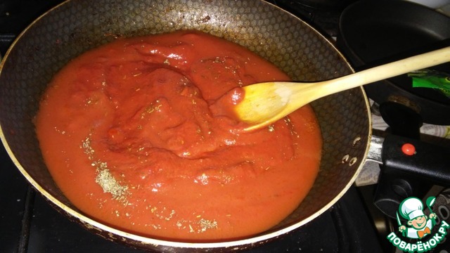 Пока стоит тесто, готовим соус. Вообще, можно обойтись и кетчупом, главное, не майонез! Такого надругательства над итальянской кухней не допустим. Потому: чеснок мелко режем, в сковороде разогреем оливковое масло и обжарим чеснок до золотистого цвета. Добавляем томатную пасту, воду (осторожно, масло брызгается), соль-сахар-специи. Доводим до кипения и варим на маленьком огне минут 15.