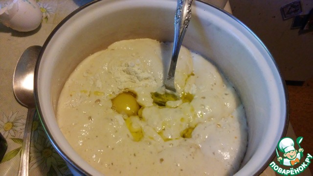 В опару добавляем яйцо, соль, масло. Постепенно вмешиваем муку - 2 стакана, можно немного больше, чтобы не липло. И сразу начинаем разделку. Оторвём кусок теста, чуть больше чем с кулак, и отложим. Остальное делим на 6 частей.
