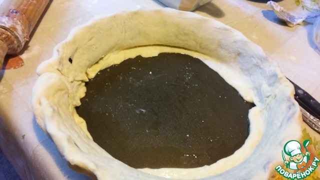 Отправив последний корж в духовку, берём заранее отложенный кусок теста. Пустим его на бортики для нашей пиццы. Раскатываем в полосу шириной сантиметров 8-10 и укладываем в форму (у меня 22 см) так, чтобы тесто небольшой полоской лежало на дне, остальная часть - на бортиках.
