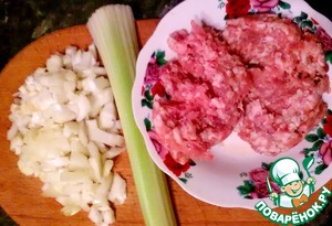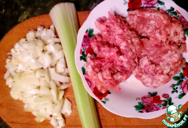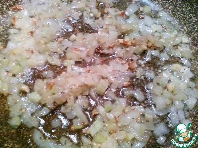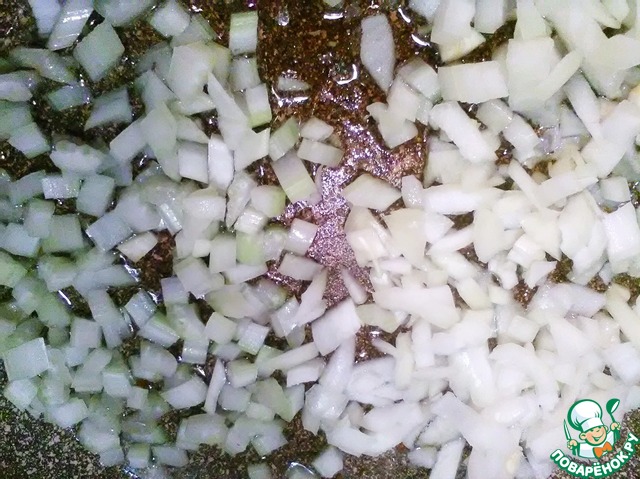 Наливаем масло в сковороду, разогреваем и добавляем лук и сельдерей. Тушим под крышкой до размягчения.