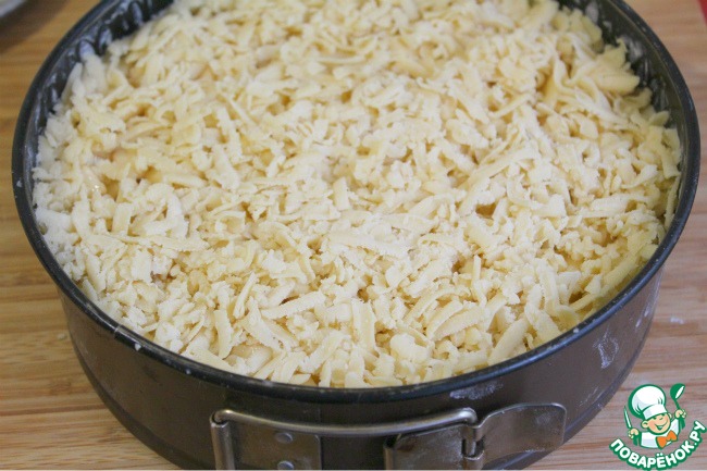 Слегка прижать и отправить в духовку на 1 час - у меня выпекался 1 час 20 минут за счет того, что форма была небольшая и слой яблок был намного выше, чем в форме на 24-26.