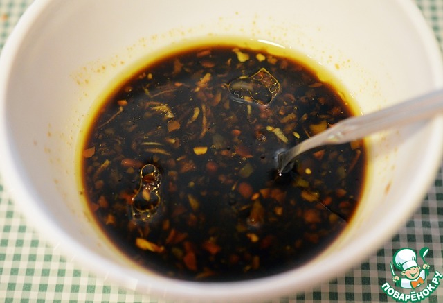 Для маринада смешать жидкие ингредиенты, твердые - почистить и натереть. Всё перемешать.