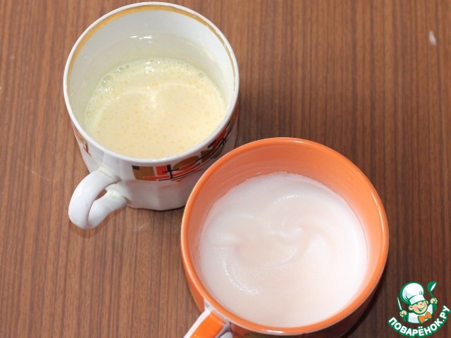 2. Разделить куриные яйца на белки и желтки. Взбить белки с 0,5 ч. л. соли до пиков. Желтки растереть с сахаром (2 ст. л).