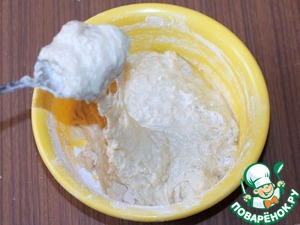 5. Всыпать просеянную муку (оставить 3 ст. л.), замесить тесто. Тесто липнет к рукам, тянется.