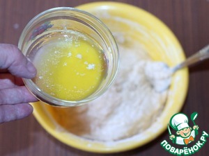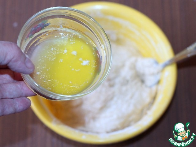 6. Влить в тесто растопленное и охлажденное сливочное масло (40 г). Хорошо вымесить тесто.