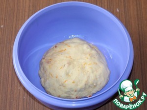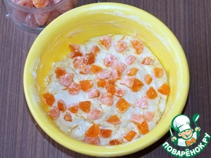 8... и порезанные на небольшие дольки вяленые Кумкваты. Перемешать. При помешивании добавить оставшуюся муку (3 ст. л.), ее вмешивать по 1 ст. л. Пальчики можно смазать растительным маслом. Тесто должно отставать от рук и от миски.