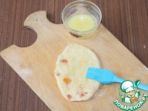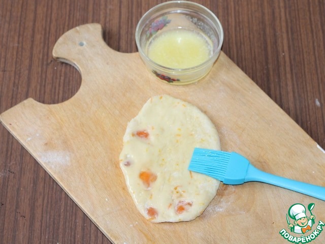 12. Раскатать каждую часть теста в лепешку с утолщенной серединой и тонкими краями. Смазать растопленным сливочным маслом. По желанию можно посыпать сахаром.