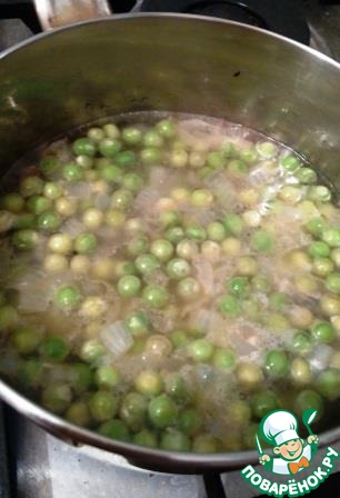 И затем залить стаканом горячей воды так, чтобы вода чуть покрывала горошек, накрыть крышкой и варить на медленном огне 10 минут, практически до готовности горошка.