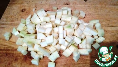 Кабачок (можно и не чистить) нарезать небольшим кубиком. Когда суп готовится из неочищенного кабачка, то цвет получается более насыщенным.
