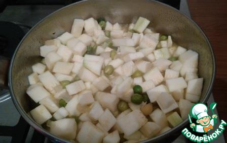 Через 10 минут к горошку добавить кабачок, все перемешать, добавить специи (соль, перец, кориандр, куркуму, лавровый лист), опять все перемешать,