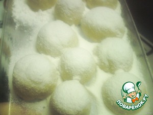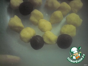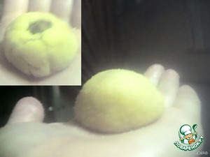 Из теста и начинки делаем шарики (я предпочитаю маленькие, на один-два укуса) где-то диаметром 2 см (тесто) и начинка - 1,5-1,7 см (то есть, практически одинаковые).
