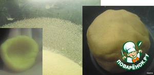 Манку смешиваем с маслом, разрыхлителем, ванильным сахаром. Все хорошо перемешать. Чтобы тесто было эластичным, понемногу добавляем воду и вымешиваем. Проверяем эластичность: из теста можно сделать такую вот чашечку. Тесто оставляем отдохнуть на час-полтора.